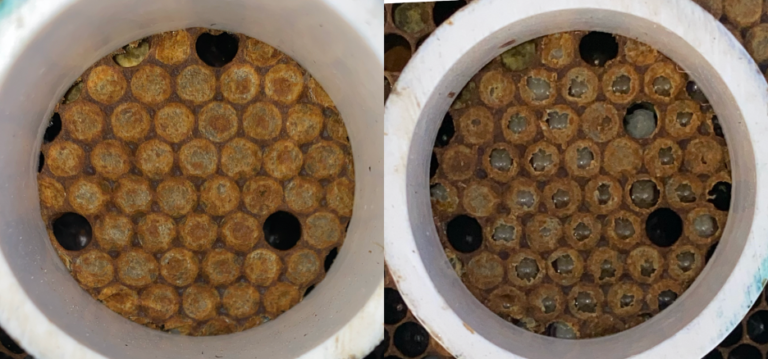 The UBeeO™ mix contains naturally occurring brood pheromones. To test a colony’s sensitivity, you firstly need to count the amount of capped brood in the test area, then the UBeeO™ mix is sprayed on to a small area of capped brood. The colony’s hygienic response to the treated brood cells after two hours indicates its ability to resist mites and disease throughout the season. Brood that is stressed by mites, viruses, or other diseases emit special pheromones through the wax cap. Patrolling nurses detect the pheromones and locate the unhealthy brood for further inspection. After two hours, the uncapped brood in the test area is counted. The first count, and the second count are added to the score sheet which calculates the final colony score.